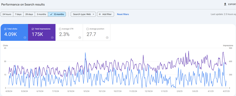 自網站改版與 SEO 優化後,北聯研磨的自然搜尋表現穩定成長。根據 Google Search Console 數據,網站過去一年累積超過 17 萬次曝光與 4 千次點擊,且點擊與曝光趨勢在近三個月明顯拉升。平均排名亦逐步提升,顯示關鍵字布局與內容優化逐漸被搜尋引擎認可,有效拓展了網站的國際能見度與潛在客戶觸及範圍。