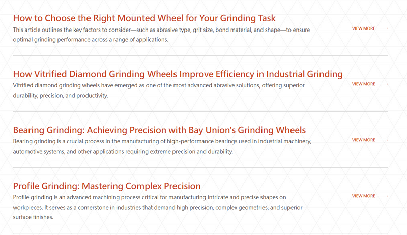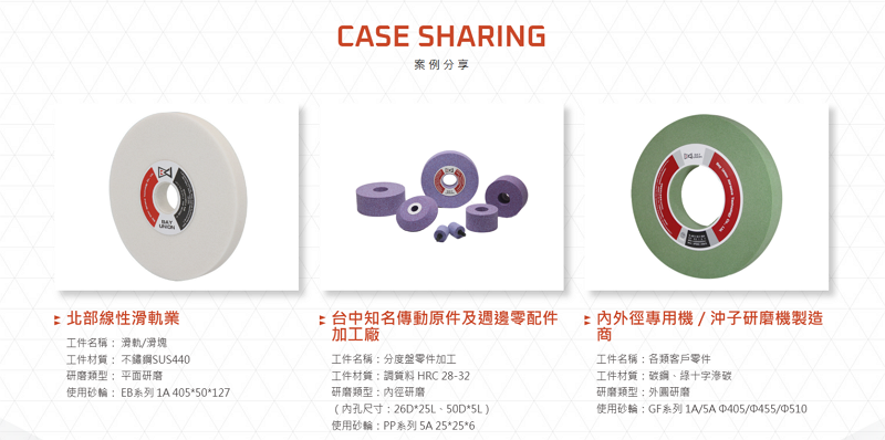 在產品子分類頁面下方,帶入與該砂輪加工應用相關的實際產業案例(如汽車零件、軸承、齒輪製造等),不僅說明產品特性,還直接展示真實應用場景,讓訪客能更具體理解砂輪產品在不同產業的使用效果,提升產品吸引力與轉換可能性。