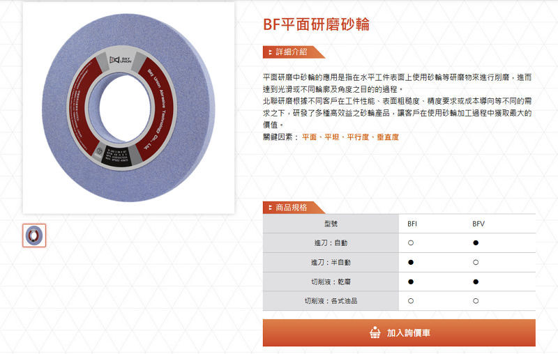 每個產品內頁皆搭配高解析產品圖片與應用說明文字,明確描述產品用途(如平面研磨加工)、應用特性與關鍵性能指標,並根據不同型號列出詳細加工方式與適用條件。內頁結構清晰,資訊分類明確,並設置加入詢價車功能,方便買家針對多項產品集中詢問,提高使用便利性與洽詢轉換率。